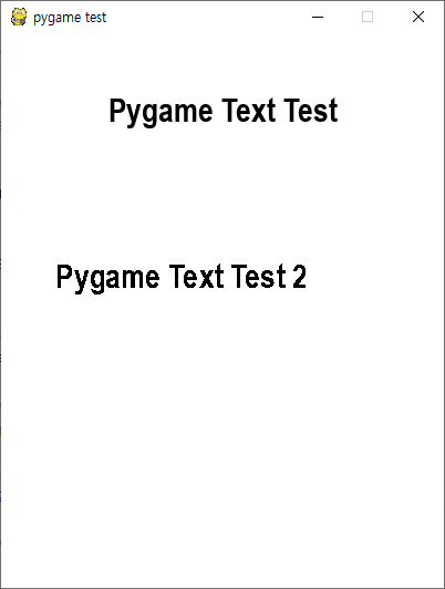 # Text를 surface에 그리기, 알리어싱, 검은색 text_Title2= myFont.render("Pygame Text Test 2", True, BLACK)