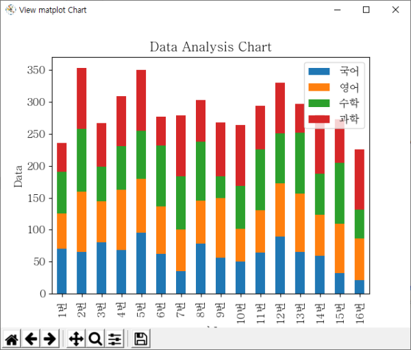 | data.plot(kind='line', x='번호', y='국어', ax=ax) data.plot(kind='line', x='번호', y='영어', ax=ax) data.plot(kind='line', x='번호', y='수학', ax=ax) data.plot(kind='line', x='번호', y='과학', ax=ax) |