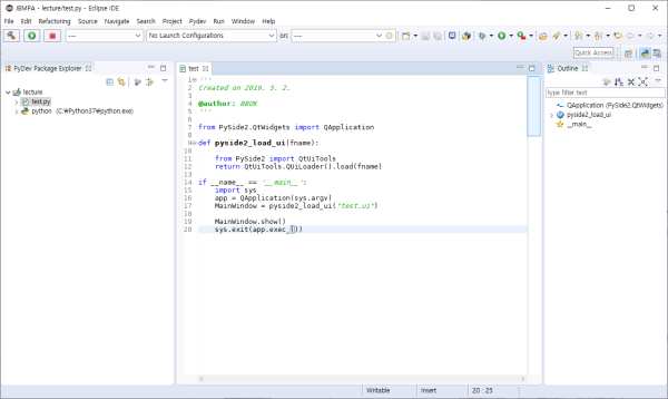 UI 파일을 작성하였다면, 다시 이클립스로 돌아와서 이전에 생성한 text.py 파일에 코드를 작성한다.